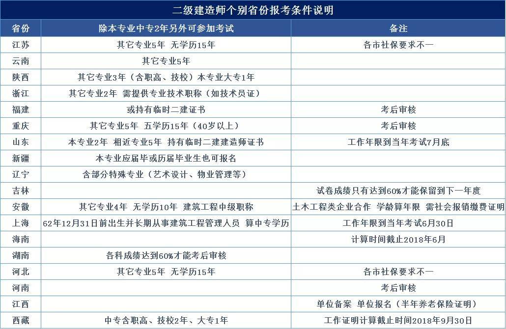 二級建造師各省前提臨時有稍微的差別,具體內在的事務見下表: